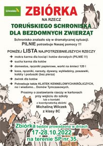 W dniach 17-28.10.2022r. na terenie naszej szkoły jest prowadzona zbiórka na rzecz toruńskiego schroniska dla bezdomnych zwierząt.