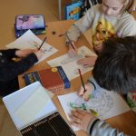 Jak można utrwalać zasady ortograficzne? Tym razem uczniowie klasy 3. zmierzyli się z ortograficznymi trudnościami pisowni _ó _i_ u_. Po powtórzeniu reguł pisowni w przygotowanych konturach liter _ó _i_ u_ uczestnicy warsztatów rysowali 10 rzeczy, w których pojawia się wskazana litera. Korzystali ze słowników ortograficznych, główkowali, by sprostać temu zadaniu. Następnie dorysowywali abstrakcyjne wzory, aby powstały najprawdziwsze mandale. A to był dopiero początek. Po skopiowaniu przygotowanych prac otrzymali ponownie wytwory swoich kolegów, tym razem w celu pokolorowania mandali i odnalezienia ukrytych przedmiotów.