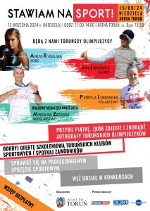 Zbliża się Narodowy Dzień Sportu, który w Toruniu będziemy obchodzić w wyjątkowy sposób. Z tej okazji serdecznie zapraszam wszystkich Państwa do udziału w wydarzeniu „Stawiam na SPORT!”, które odbędzie się 15 września 2024 roku