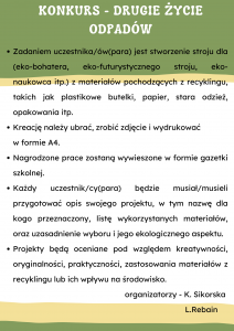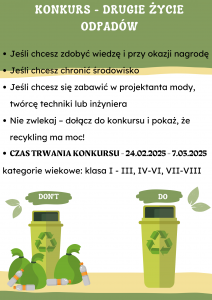 Zapraszamy uczniów SP 35 do wzięcia udziału w konkursie „Drugie życie odpadów”. Wszelkie informacje znajdują się na plakatach oraz regulaminie konkursu.