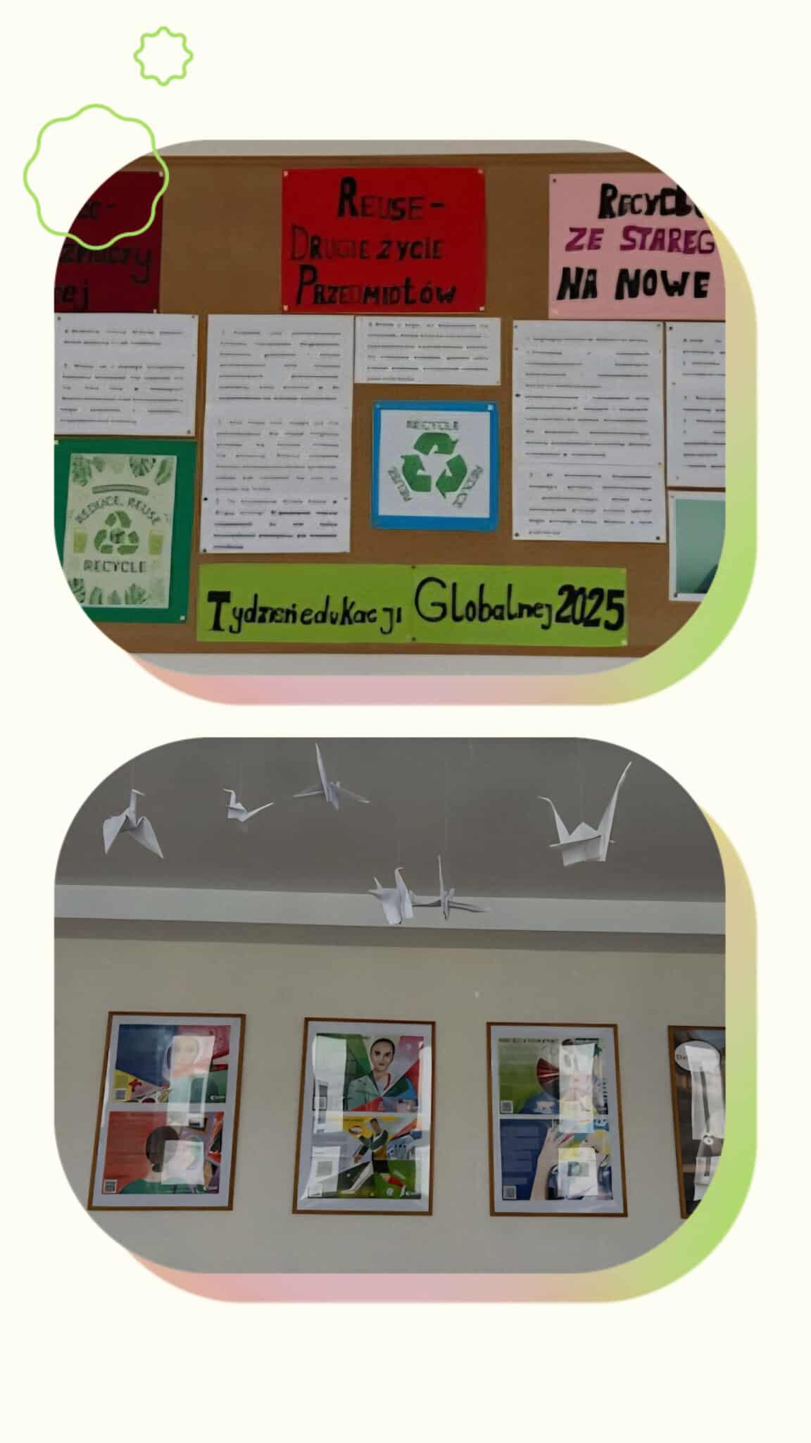 Symbolem tej nadziei stały się papierowe żurawie 🕊️✂️, zawieszone w szkolnej przestrzeni i wykonane wspólnie przez uczniów oraz nauczycieli. Żurawie – znak pokoju i dobrych życzeń – przypominały nam, że nawet małe kroki, podejmowane razem 🤝, mogą prowadzić do wielkich zmian 🌱✨