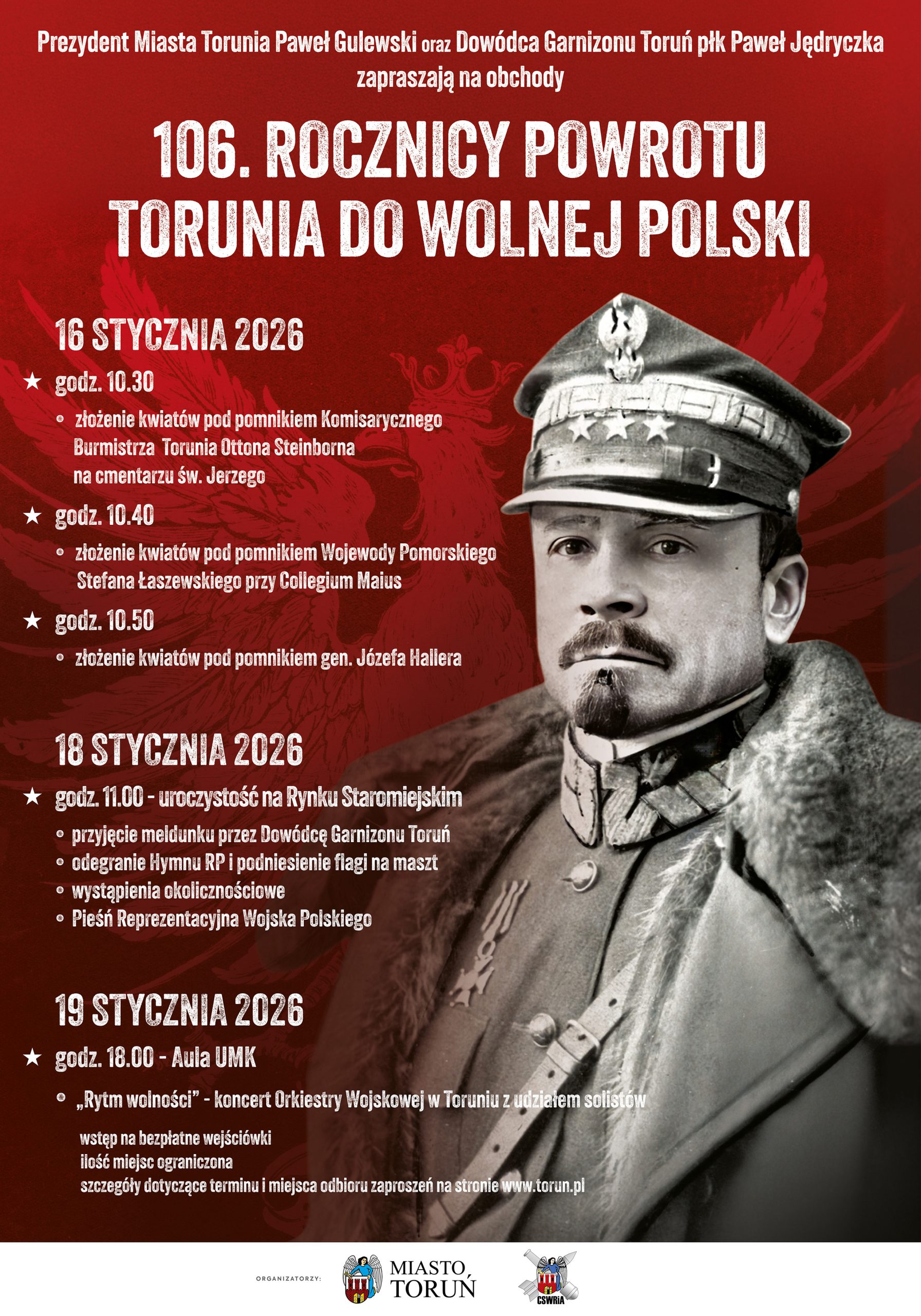 w imieniu organizatorów przekazujemy zaproszenie na obchody 106. rocznicy powrotu Torunia do wolnej Polski – jednego z najważniejszych wydarzeń w historii naszego miasta 🇵🇱🏛️