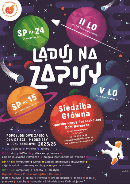 Szanowni Państwo, Ognisko Pracy Pozaszkolnej – Dom Harcerza rozpoczęło rekrutację na rok szkolny 2025/2026 na bezpłatne zajęcia dla dzieci i młodzieży od 5 do 19