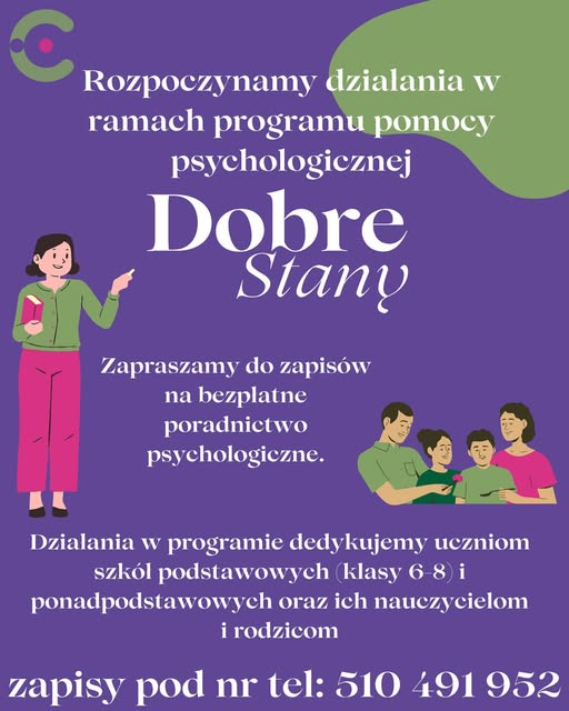 Szanowni Rodzice! Zapraszamy do zapoznania się z informacją w ramach programu DobreStany. Oferowane jest bezpłatne poradnictwo psychologiczne dla rodziców uczniów szkół podstawowych (klas 6-8) i