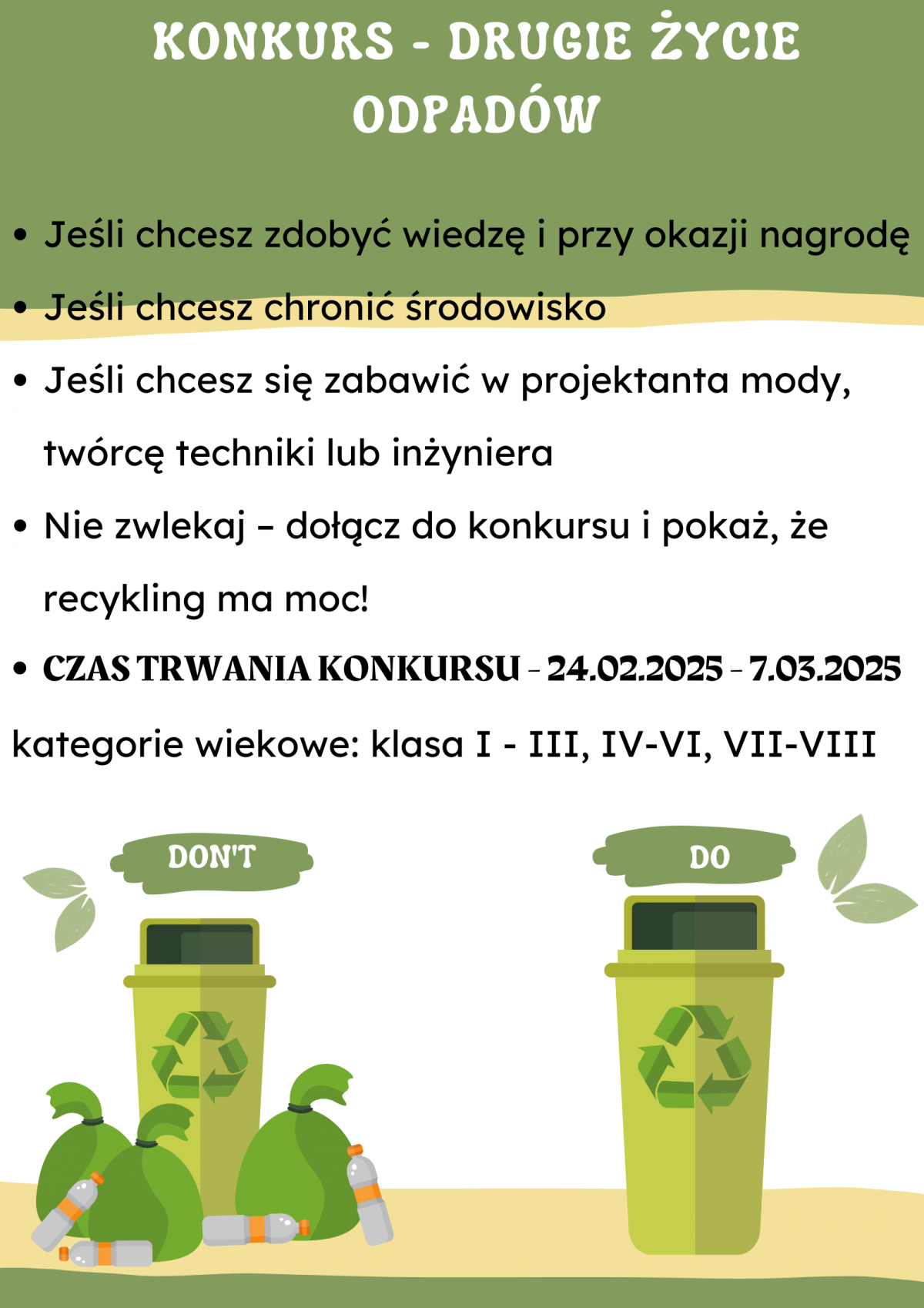 Zapraszamy uczniów SP 35 do wzięcia udziału w konkursie „Drugie życie odpadów”. Wszelkie informacje znajdują się na plakatach oraz regulaminie konkursu. REGULAMIN KONKURSU odpady