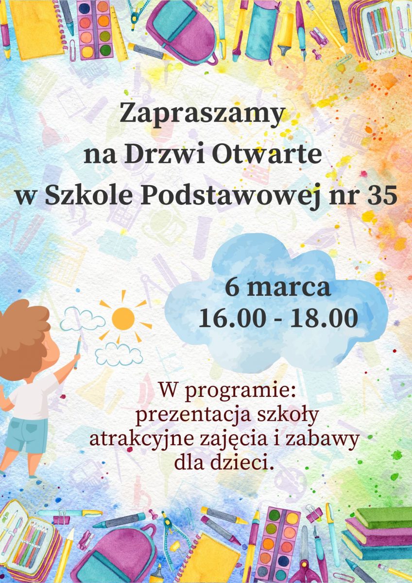 Szanowni Państwo serdecznie zapraszamy na Drzwi Otwarte w SP 35 06.03.2025 r. godzina 16.00-18.00 Czekamy na Was.
