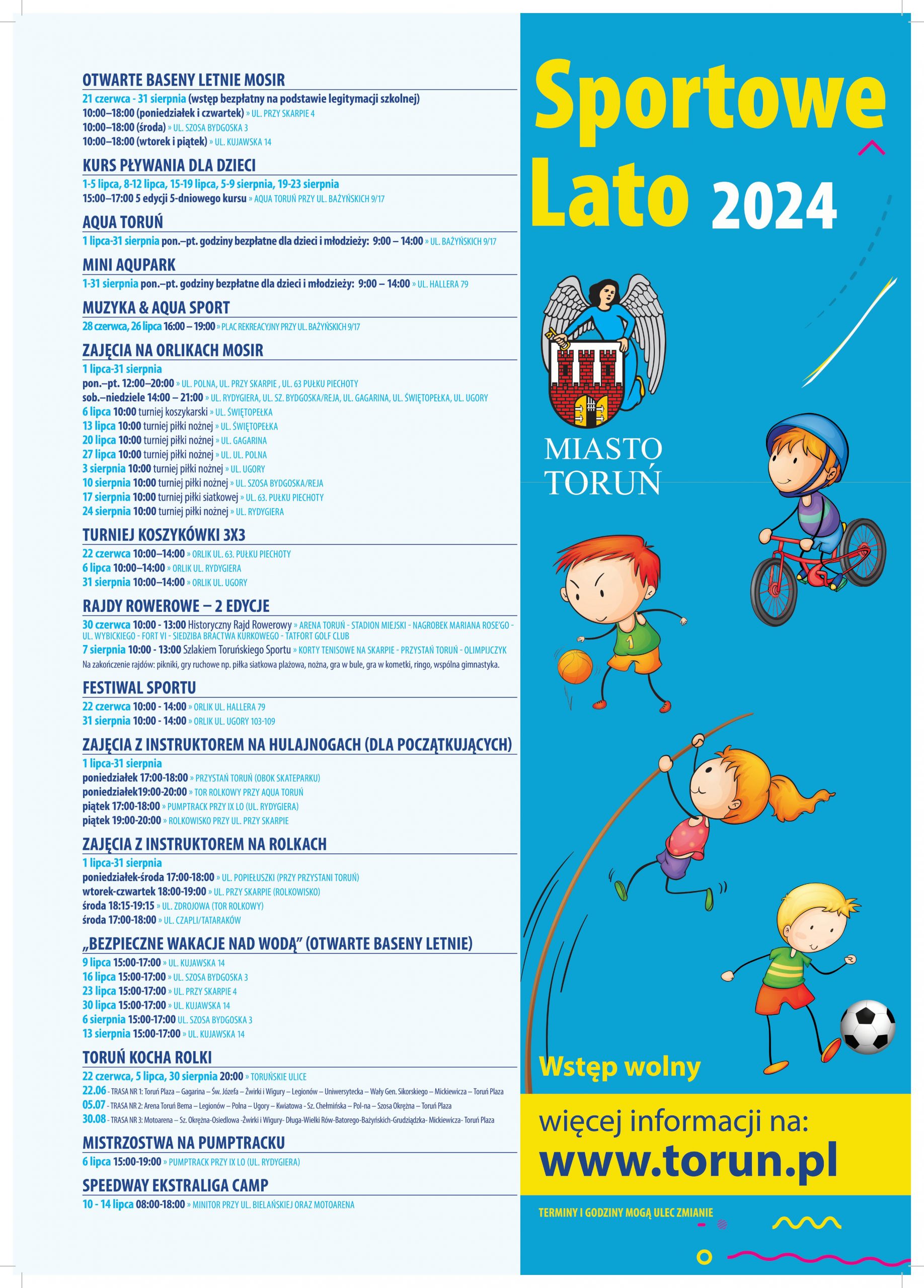 Szanowni Państwo, Gmina Miasta Toruń organizuje wydarzenia zachęcające do aktywnego spędzania czasu. „SPORTOWE LATO 2024” jest to szereg wakacyjnych wydarzeń skierowanych do dzieci i młodzieży,