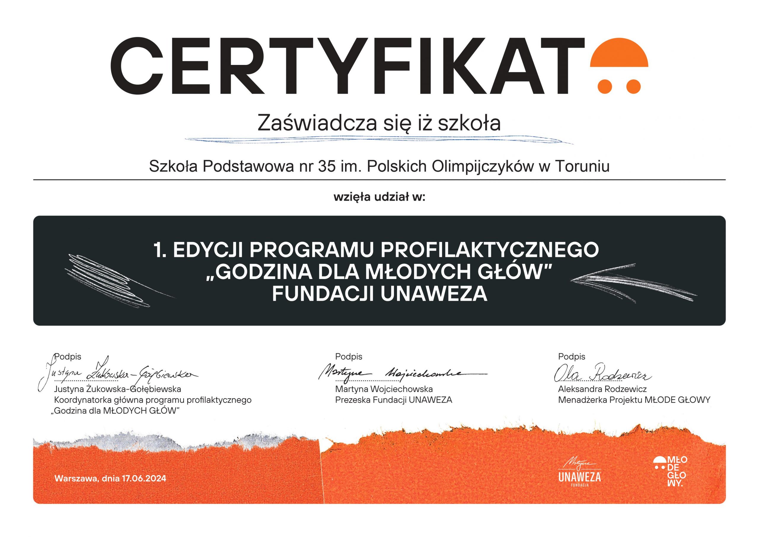 1.edycja programu profilaktycznego ,,Godzina dla MŁODYCH GŁÓW” realizowanego przez Fundację UNAWEZA Martyny Wojciechowskiej zakończona. Mamy nadzieję, że program stał się źródłem nadziei i inspiracji dla