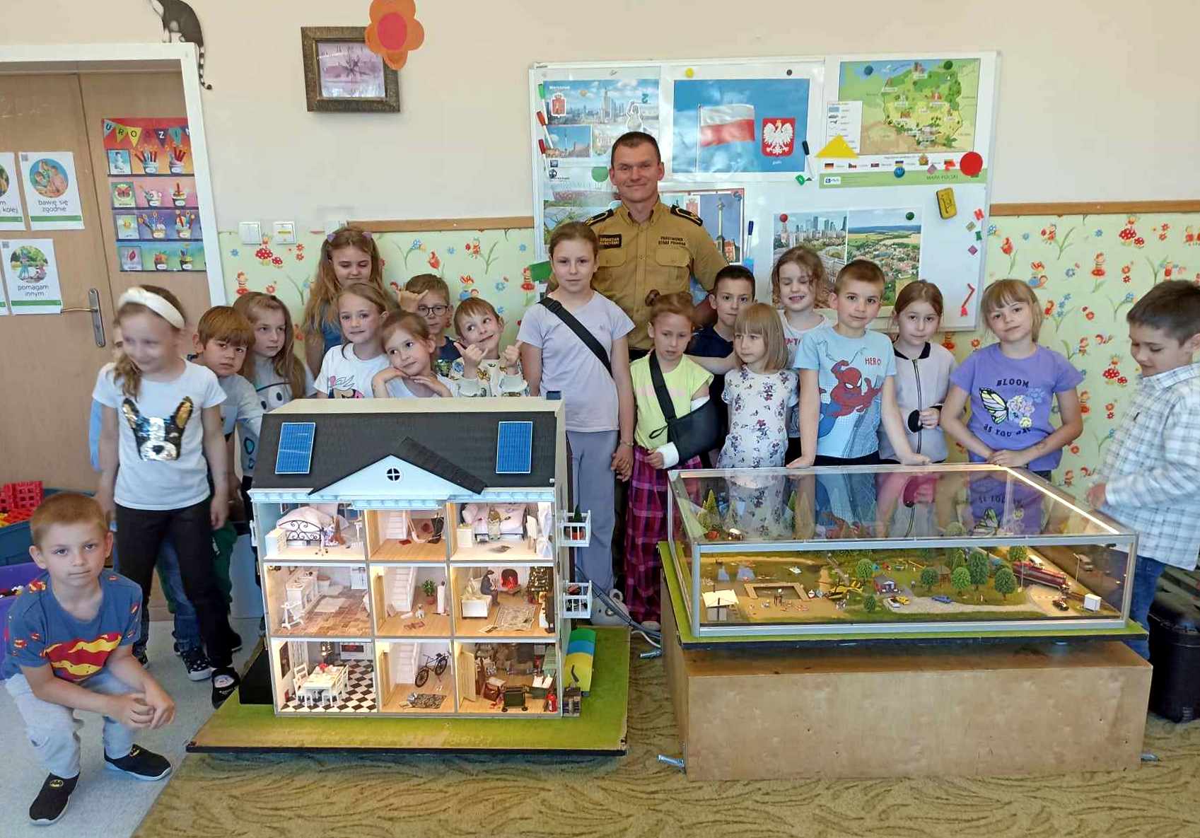 13 maja dzieci z grupy Elfy i Smerfy odwiedził mł. asp. Sebastian Duszyński z OSP Grębocin, który zaprezentował przedszkolakom makietę „Domek Zagrożeń” z Komendy Wojewódzkiej
