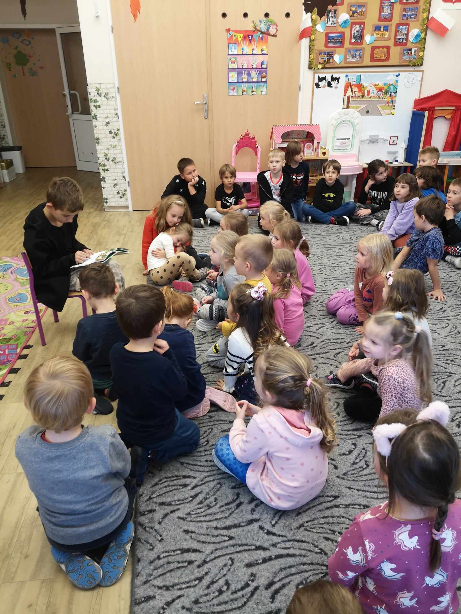 W piątek 20 października 2023 r. grupę Krasnale odwiedziła klasa IIb. Uczniowie przeczytali przedszkolakom bajkę „Trzy małe świnki”. Mieli okazję poćwiczyć umiejętność czytania oraz podzielić