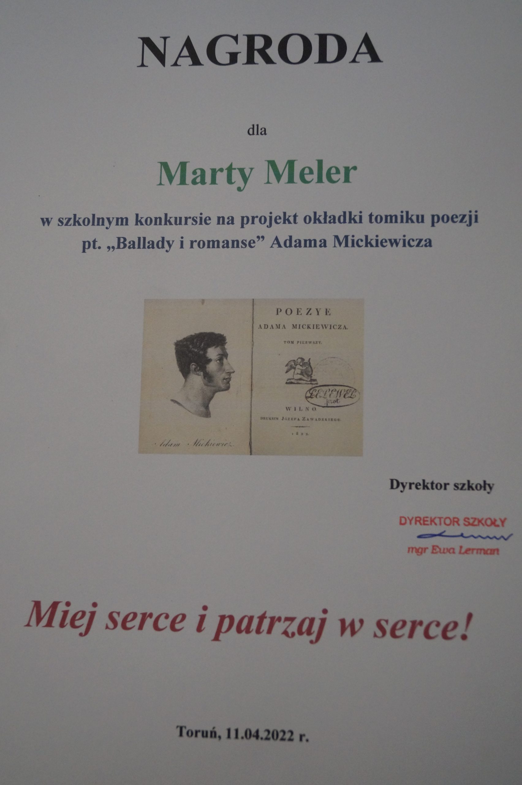 Projekt na okładkę tomiku poezji Adama Mickiewicza pt. ,,Ballady i romanse” Marta Meler z klasy VII c zdobyła nagrodę w konkursie na projekt okładki z okazji